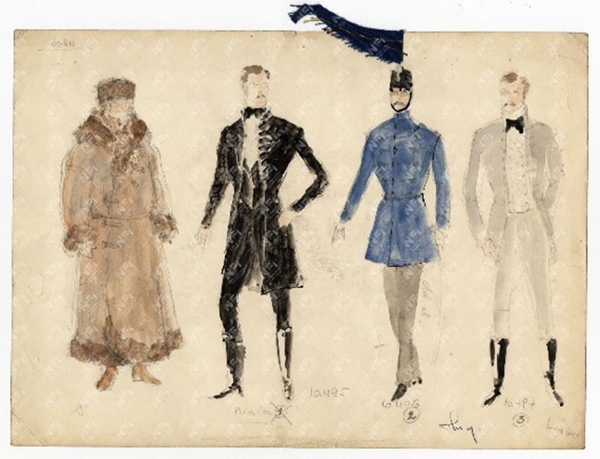 A terven látható első öltözet szintén a még orosz területeken játszódó jelenetekhez készült. Az ábrázolt prémes kucsma és bunda jobban hasonlít Ödön barátjának, a Bujtor István által alakított Leonin ezredesnek a kemény orosz télben való utazáskor viselt jelmezére. Itt is könnyen elképzelhető, hogy a szereplőket a Jelmezkölcsönzőből[6] öltöztették fel.